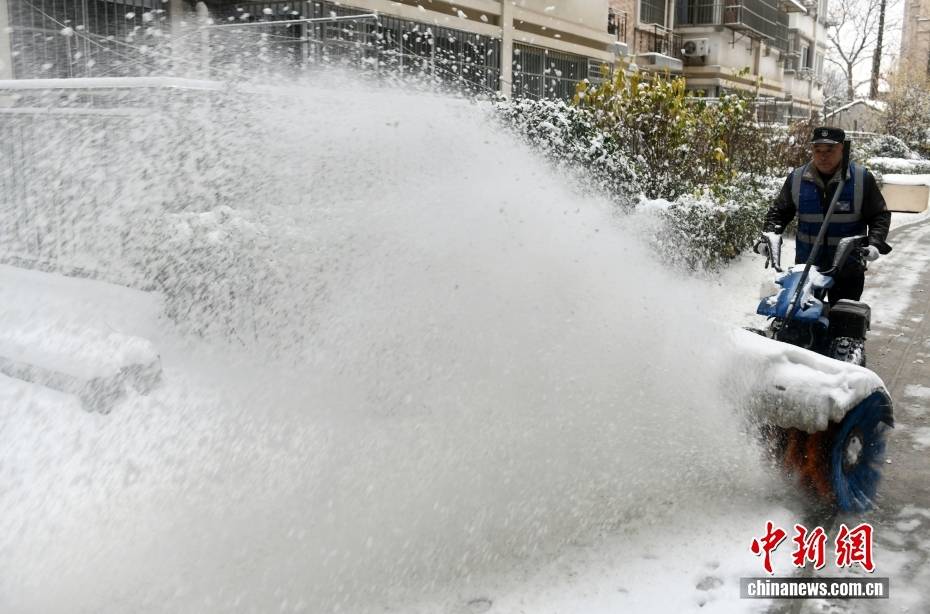 1月20日,安徽省六安市金安区一小区,物业人员正用机器清除积雪,保障居民安全出行。图/CNSphoto 郑金强 摄