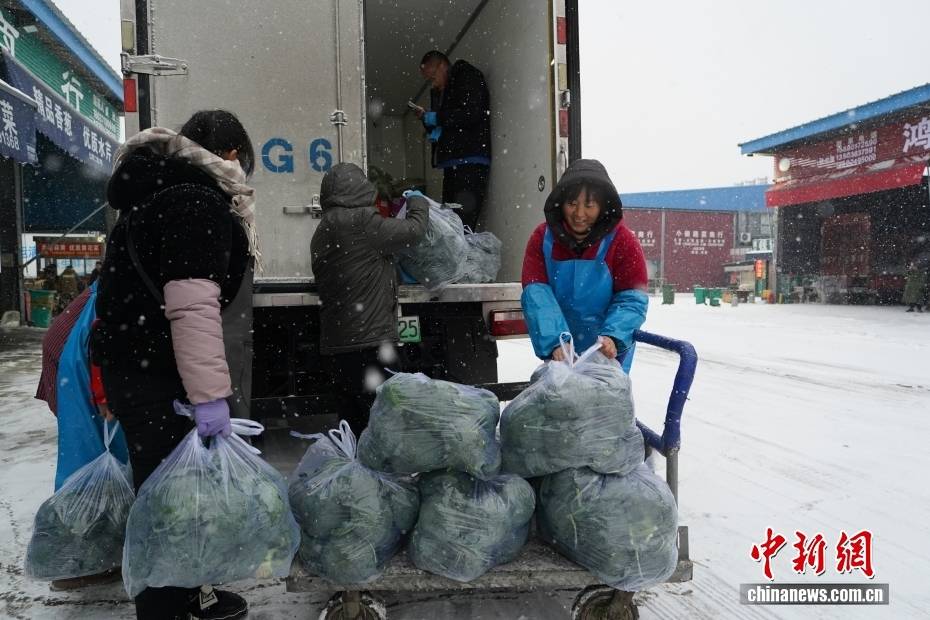 1月19日,河南迎来大范围低温雨雪冰冻天气。作为中部地区重要的农产品集散枢纽,河南万邦国际农产品物流园从货源储备、物流调度到价格稳控全面保障市场果蔬供应。图为菜商在搬运蔬菜。中新社发 王佳宁 摄