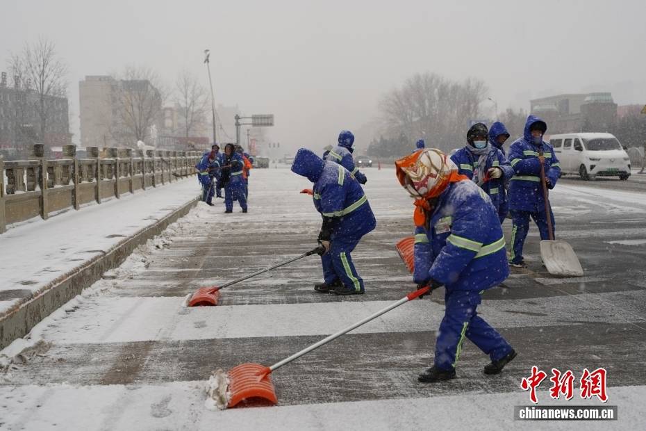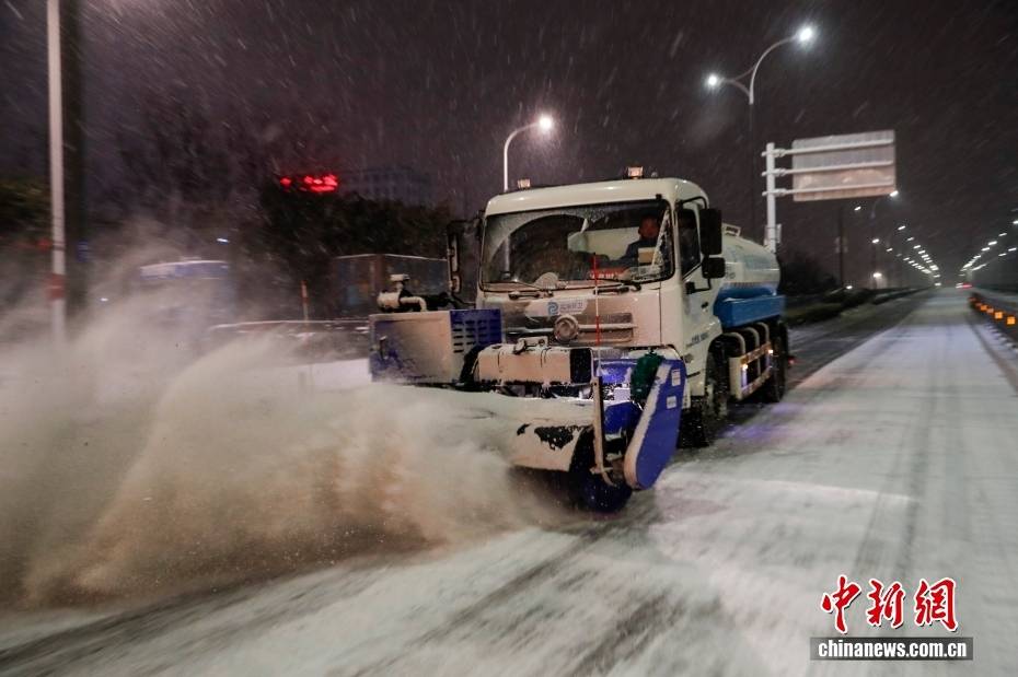 1月20日凌晨,江苏省淮安市机关、社区、环卫、应急管理等多个部门干部职工,分布在城市主要道路,连夜清除路面积雪,保障人们出行安全畅通。图为1月20日,江苏淮安清江浦区环卫工人在路面除雪。图/CNSphoto 赵启瑞 摄
