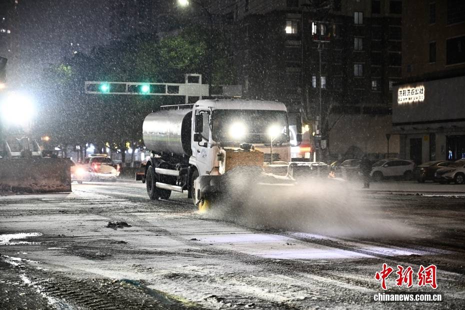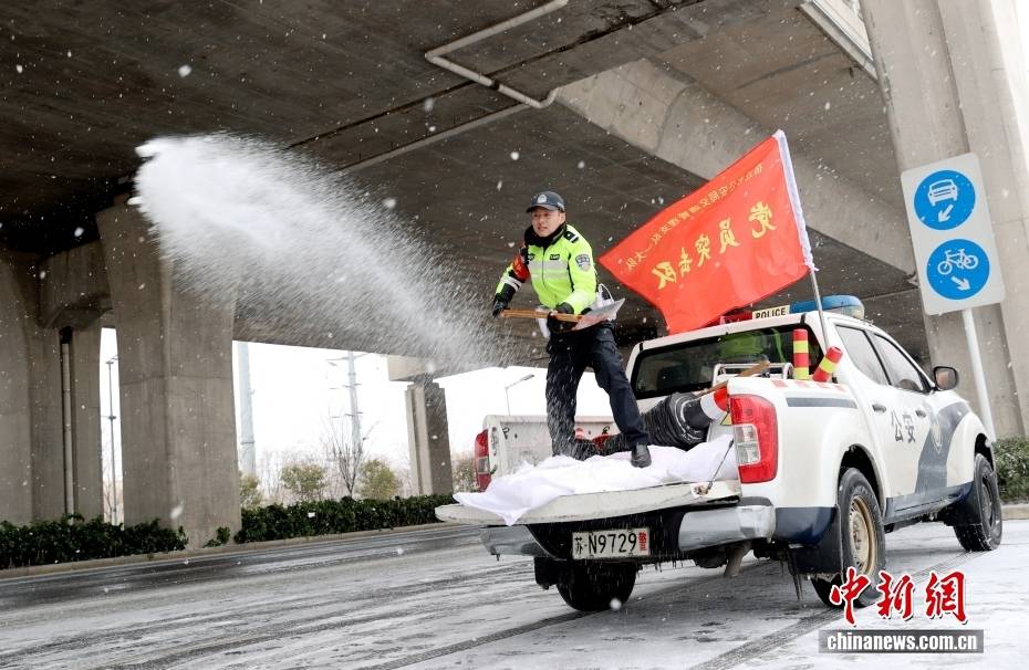 1月19日,江苏宿迁市迎来2026年首场降雪天气。在省宿迁经济技术开发区,宿迁市公安局交通管理支队一大队民警在重点路段撒盐除雪,消除路面道路交通安全隐患。图/CNSphoto 王力 摄