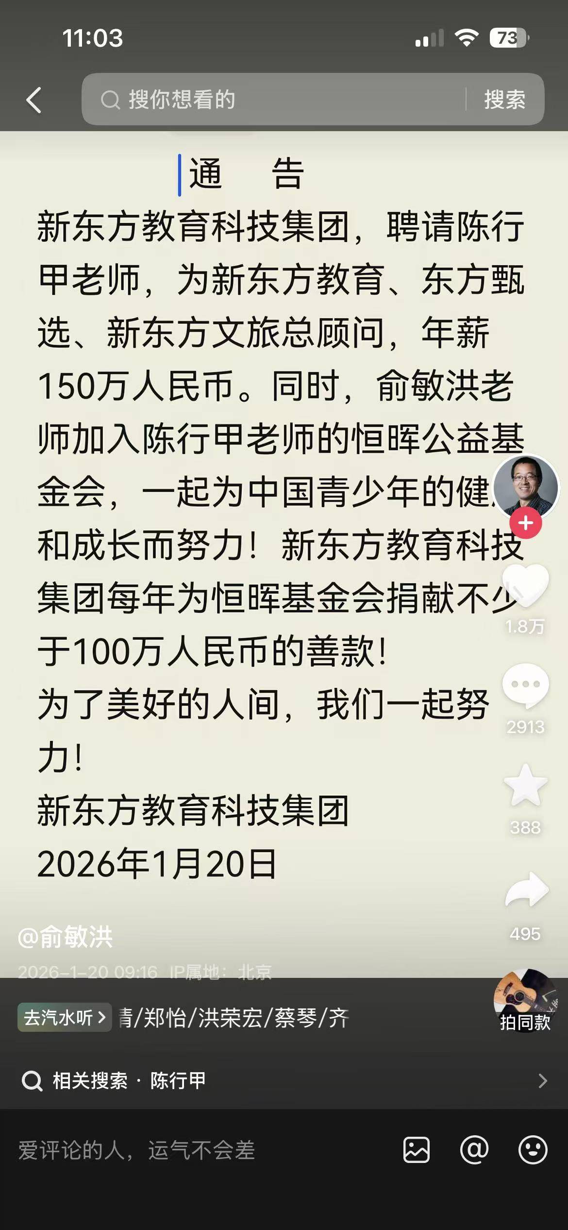 1月20日,新东方创始人俞敏洪在自己个人抖音号,以新东方教育科技集团名义发布了一则通告:“新东方教育科技集团,聘请陈行甲老师,为新东方教育、东方甄选、新东方文旅总顾问,年薪150万人民币。”