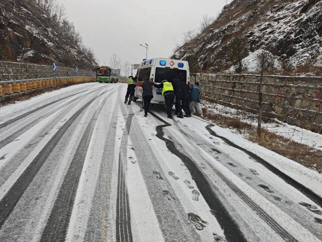 1月19日上午10时许,南召县交警大队特勤中队4名民辅警执行巡逻任务时,发现一辆救护车因路面结冰打滑,被困在冰雪中无法前行。巡逻民辅警立即上前实施救援,得知这辆救护车正在执行急救任务,运送两名交通事故受伤人员前往医院。面对这一“急上加急”的紧急情况,巡逻民辅警二话没说,俯身在冰冷的雪地上用力推车,将救护车推出被困区域,回到安全路面。在确认救护车行驶状态正常后,巡逻民辅警驾驶警车开道护航,引导救护车避开结冰路段,顺利驶入主干道。