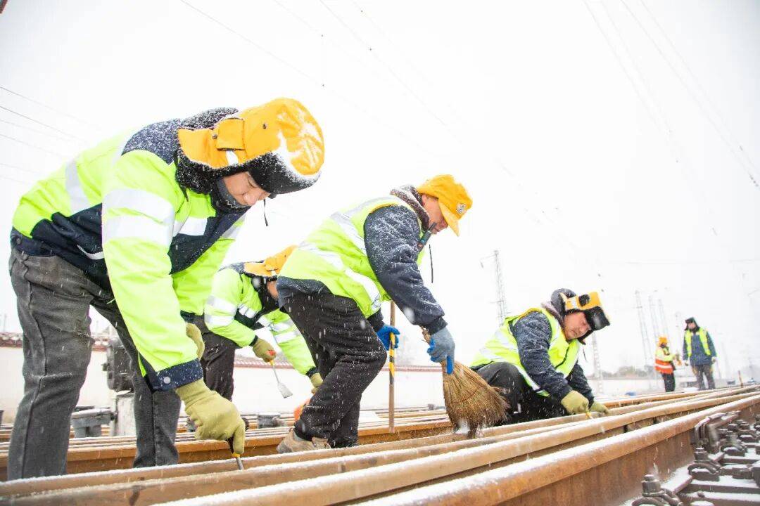 除雪队伍奋战在每一组道岔之上,坚守在每一处除雪打冰关键地带,他们不畏严寒、分工明确,有的挥舞扫帚清扫道岔表面积雪,有的手持除冰铲铲除滑床板、辙叉轮缘槽内的积冰,有的精准撒布融雪剂防止二次结冰,他们顶风冒雪、干劲十足,不放过一处死角、不遗留一丝隐患。