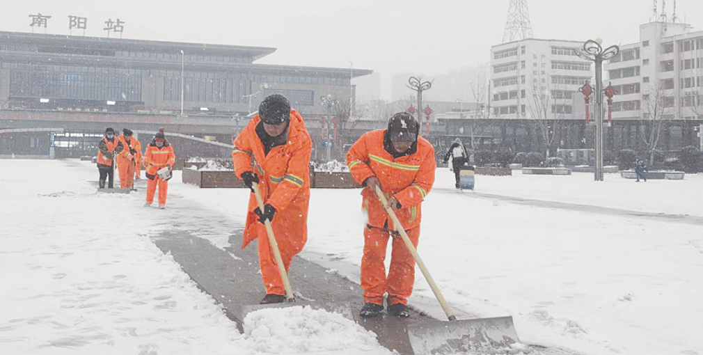 滨河大道下穿隧道里,一台铲雪车将被过往车辆压实的积雪铲起,黑黝黝的路面很快便显现出来,给人稳稳的安全感;南阳东站站前广场,环卫工人们挥舞铁锹铲雪,确保旅客出行安全、畅通;医圣祠等重要点位周边,环卫工人们正紧张地布撒融雪剂……白茫茫的风雪中,环卫工人奋战一线的身影汇成一道“橙色风景”,那么温暖,那么动人!