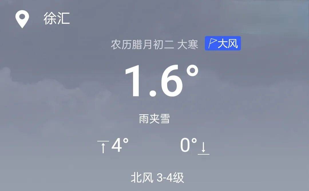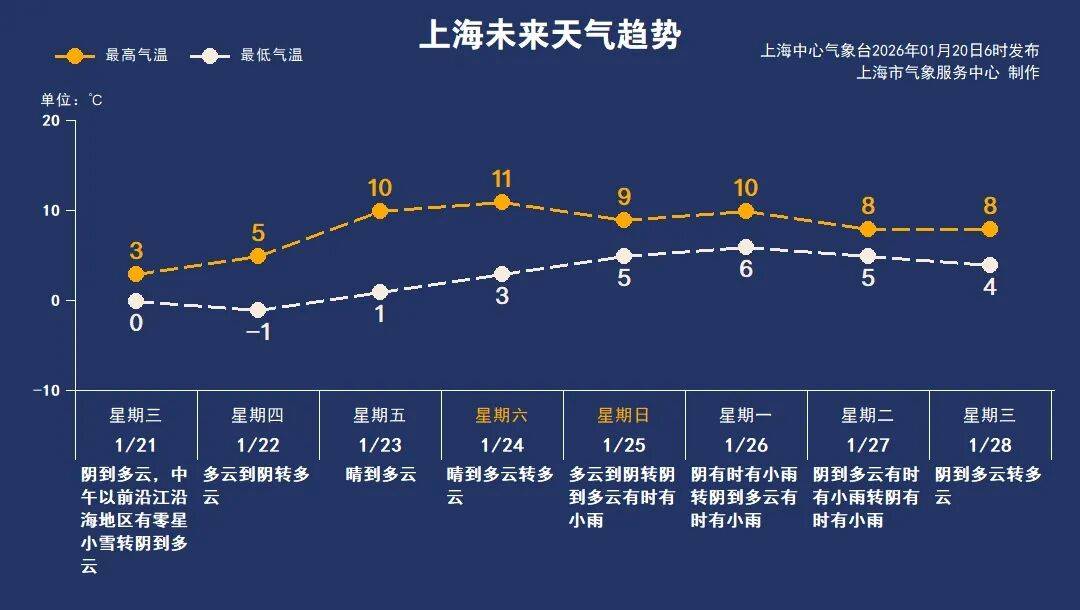 昨夜今晨本市多个郊区,以及市区徐家汇站都陆续出现了小雪。今天(1月20日)阴有时有小雪或小雨夹雪,下午转阴到多云局部有小雪或小雨夹雪。气温全天低位运行,预计白天最高气温仅4℃附近。大风持续,偏北风4~5级阵风6级,沿江沿海地区5~6级阵风7级。相对湿度90%~60%。气温低,湿度大,叠加风寒效应,寒冷感升级,一定要做好防风保暖。雨雪天气,出行也要特别注意道路交通安全。