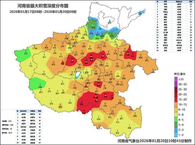 2026年1月17日8时至20日8时河南省累计降雪量