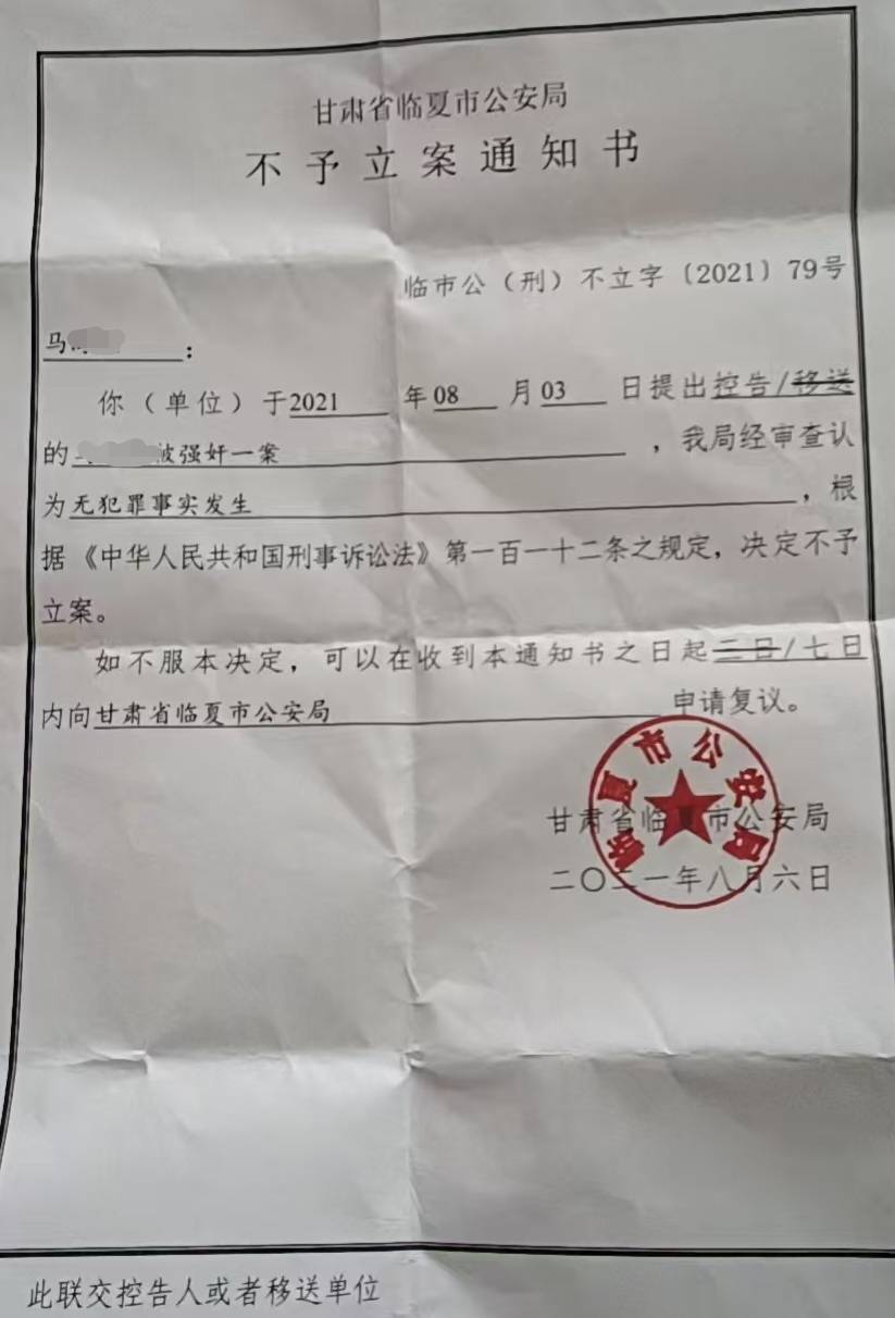 三天后的2021年8月6日,临夏市公安局向小燕下达《不予立案通知书》,针对她控告的被强奸一案,“我局经审查认为无犯罪事实发生”,决定不予立案。