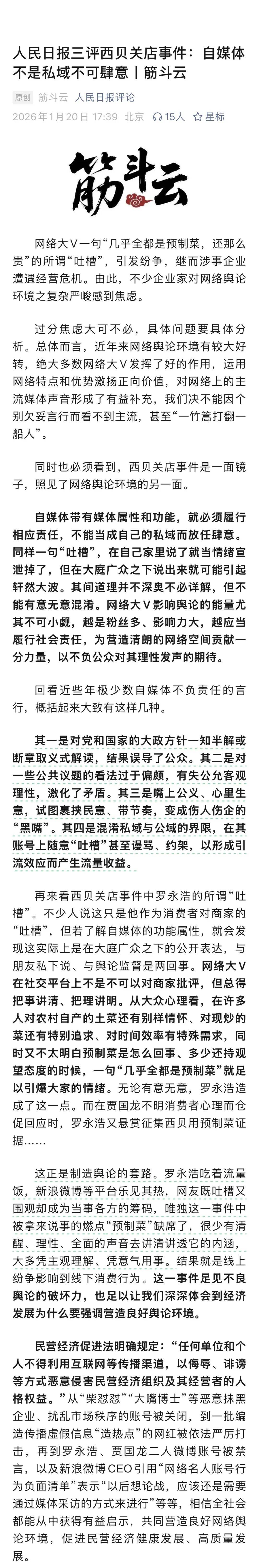 继1月18、19日发布评论文章后,今日,人民日报再发布评论文章《人民日报三评西贝关店事件:自媒体不是私域不可肆意丨筋斗云》,其中提到:西贝关店事件是一面镜子,照见了网络舆论环境的另一面。自媒体带有媒体属性和功能,就必须履行相应责任,不能当成自己的私域而放任肆意。同样一句“吐槽”,在自己家里说了就当情绪渲泄掉了,但在大庭广众之下说出来就可能引起轩然大波。其间道理并不深奥不必详解,但不能有意无意混淆。网络大V影响舆论的能量尤其不可小觑,越是粉丝多、影响力大,越应当履行社会责任,为营造清朗的网络空间贡献一分力量,以不负公众对其理性发声的期待。
