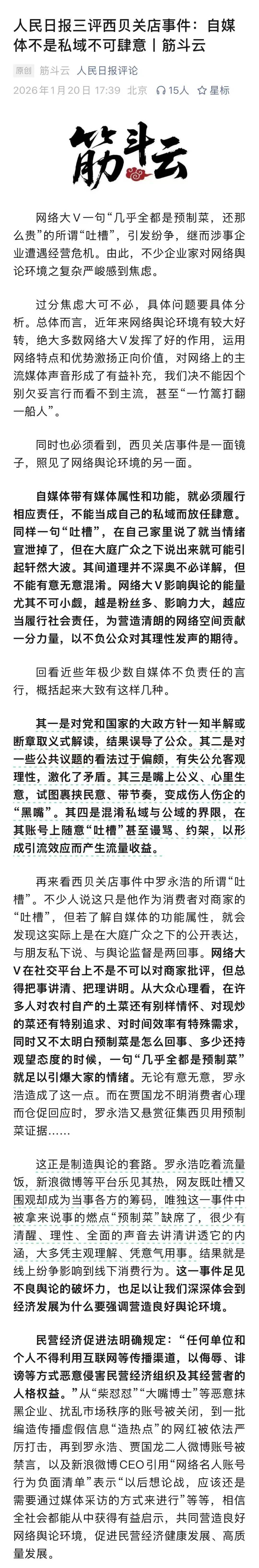1月20日,人民日报评论再发文章《人民日报三评西贝关店事件:自媒体不是私域不可肆意丨筋斗云》,其中提到:西贝关店事件是一面镜子,照见了网络舆论环境的另一面。自媒体带有媒体属性和功能,就必须履行相应责任,不能当成自己的私域而放任肆意。同样一句“吐槽”,在自己家里说了就当情绪渲泄掉了,但在大庭广众之下说出来就可能引起轩然大波。其间道理并不深奥不必详解,但不能有意无意混淆。网络大V影响舆论的能量尤其不可小觑,越是粉丝多、影响力大,越应当履行社会责任,为营造清朗的网络空间贡献一分力量,以不负公众对其理性发声的期待。
