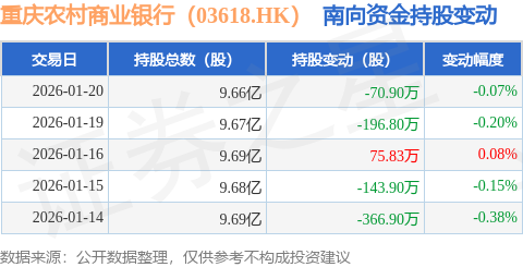 证券之星消息,1月20日南向资金减持70.9万股重庆农村商业银行(03618.HK)。近5个交易日中,获南向资金减持的有4天,累计净减持702.67万股。近20个交易日中,获南向资金减持的有12天,累计净减持3414.27万股。截至目前,南向资金持有重庆农村商业银行(03618.HK)9.66亿股,占公司已发行普通股的38.43%。
