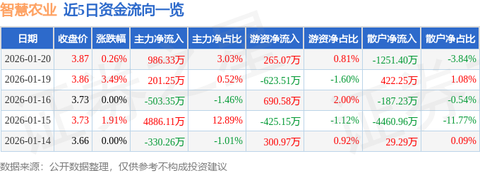 证券之星消息,截至2026年1月20日收盘,智慧农业(000816)报收于3.87元,上涨0.26%,换手率5.87%,成交量84.31万手,成交额3.26亿元。