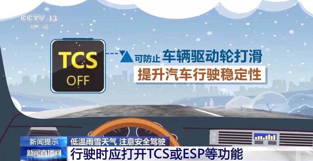 所以,驾驶人应掌握一定的安全驾驶要点,以保证冰雪道路上的行车安全,车上有TCS或ESP等功能的一定要打开。TCS可防止车辆驱动轮打滑,提升汽车行驶稳定性;ESP是车身电子稳定系统,可防止车辆侧滑,稳定车身。