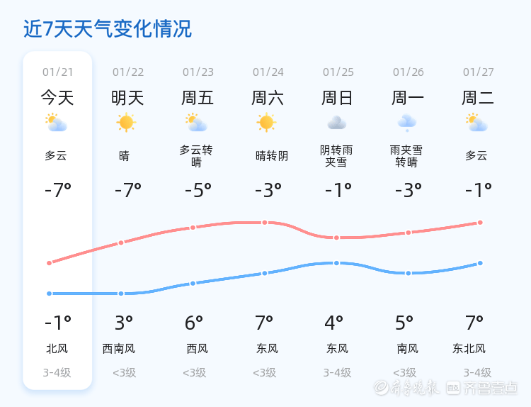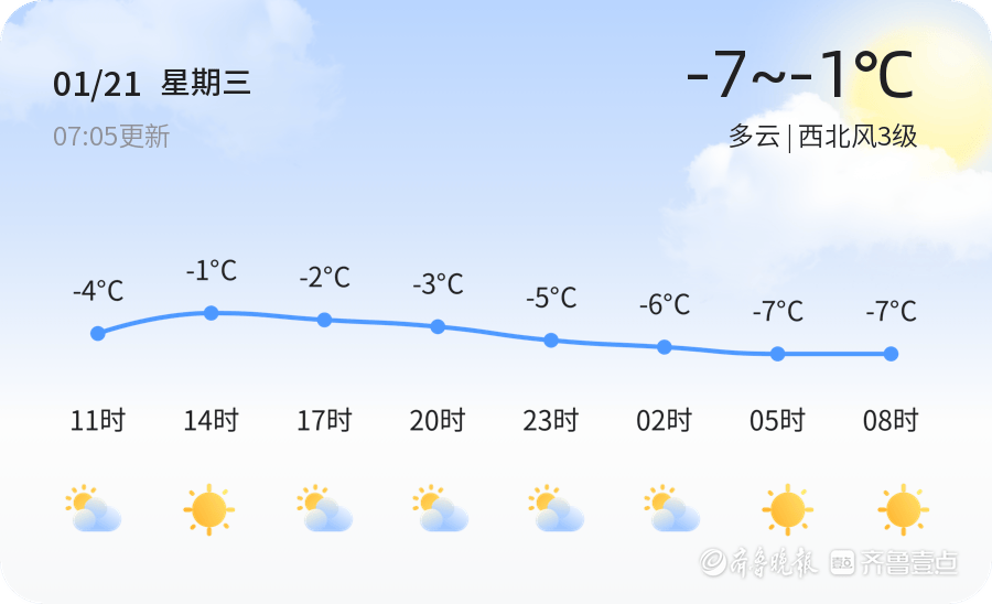 今天是1月21日,星期三,农历十二月初三。临沂市迎来多云天气,气温在-7℃到-1℃之间波动。西北风3级,空气湿度为45%,PM2.5值为32,空气质量良好。各区天气状况基本一致,以多云为主,气温较低。