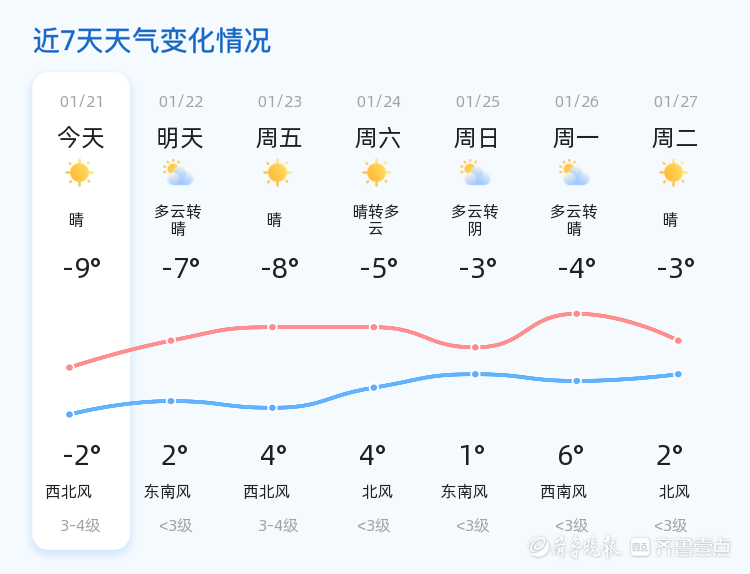 今天是2026年1月21日,农历十二月初三,星期三。东营市迎来寒潮天气,今天整体天气晴朗,但气温较低,全市各区最低气温达到-9℃,最高气温为-2℃。当前气温为-8.7℃,西风2级,空气湿度为42%,PM2.5指数为56,空气质量良好。