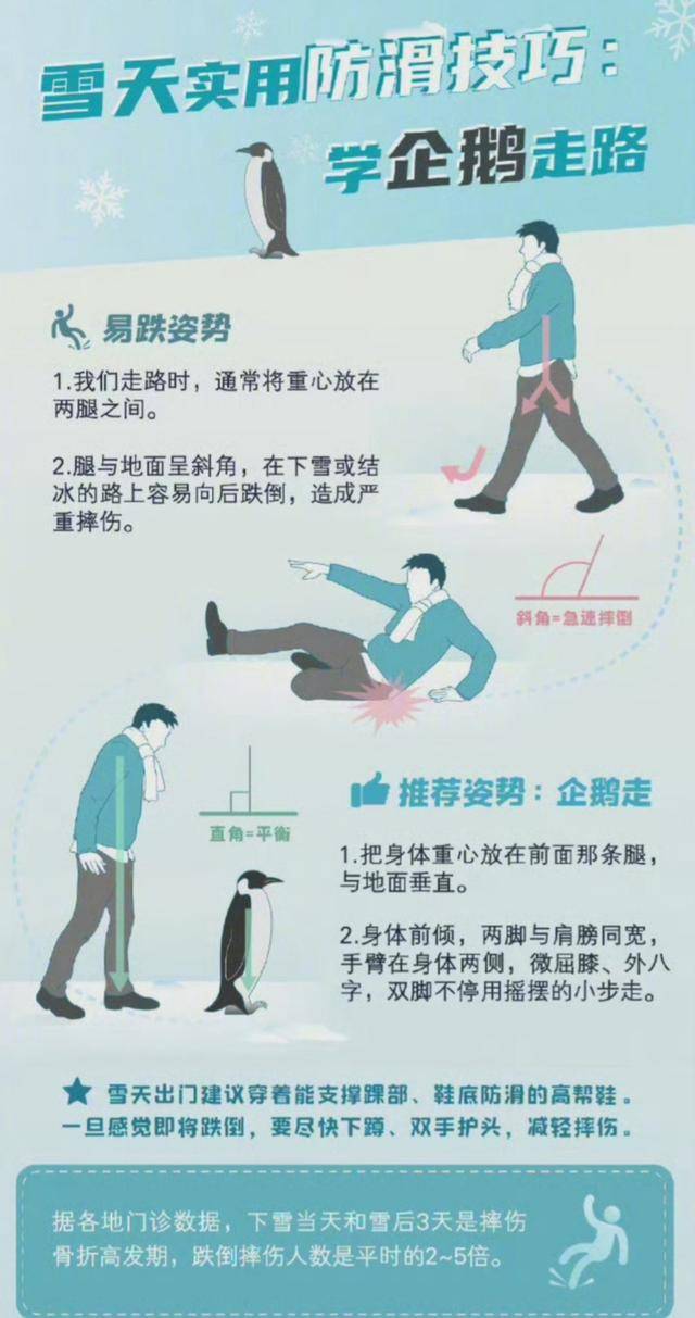 步行遇到结冰路面一起来学习“企鹅走路”动作避免雪天滑倒