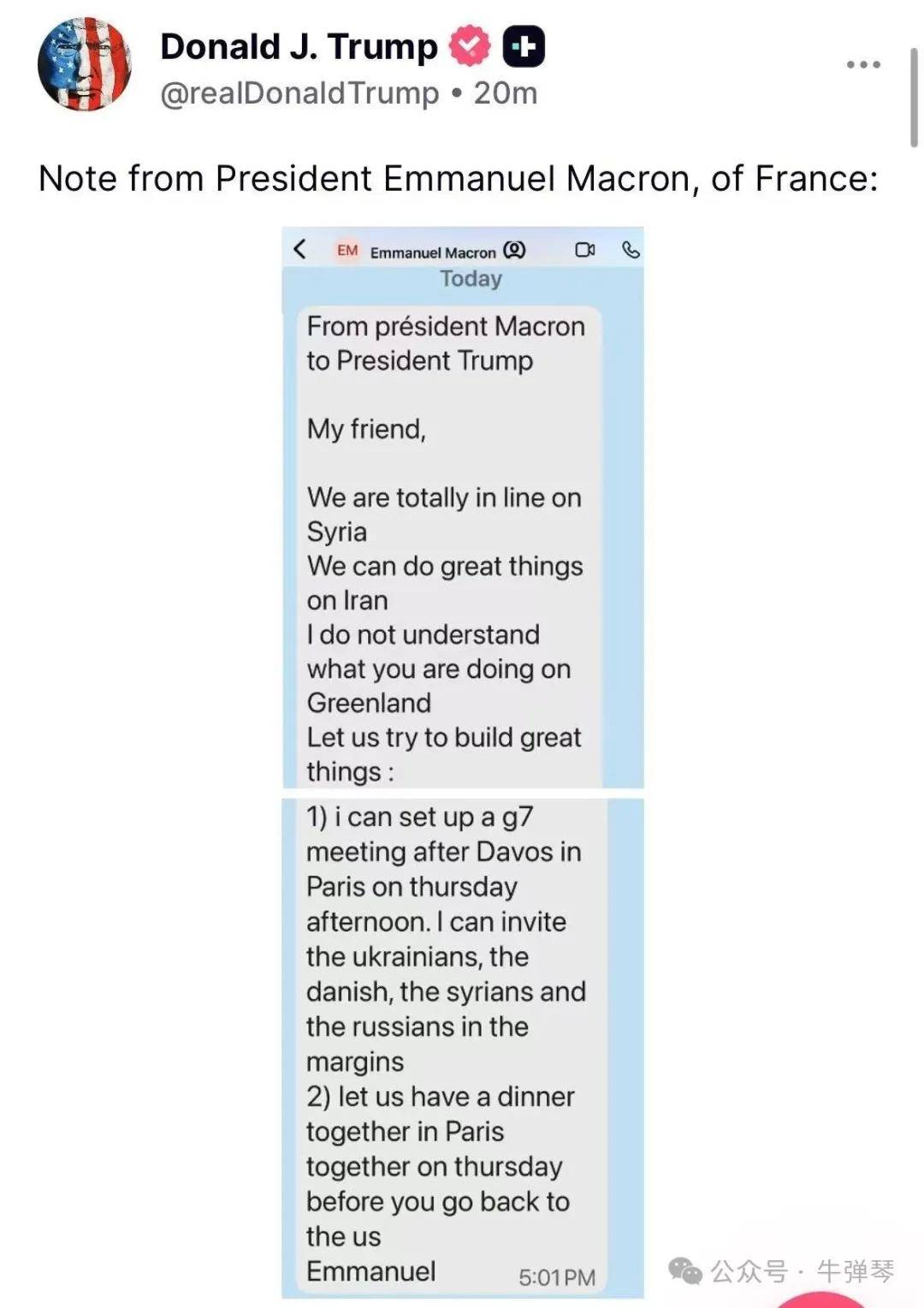 马克龙向特朗普提出两项建议:“1)世界经济论坛年会(即达沃斯论坛)之后,我可以安排七国集团(G7)于22日在巴黎召开一场会议,并可以在会议间隙邀请乌克兰、丹麦、叙利亚和俄罗斯代表。2)在你返回美国之前,让我们22日晚间在巴黎共进晚餐。”