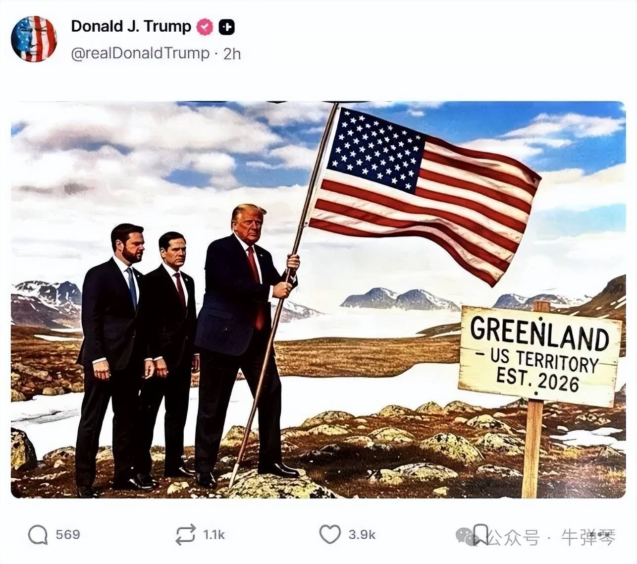 一张他带着副总统万斯和国务卿鲁比奥,将星条旗插到格陵兰岛,旁边的牌子上写着:“格陵兰:美国领土,始于2026年。”