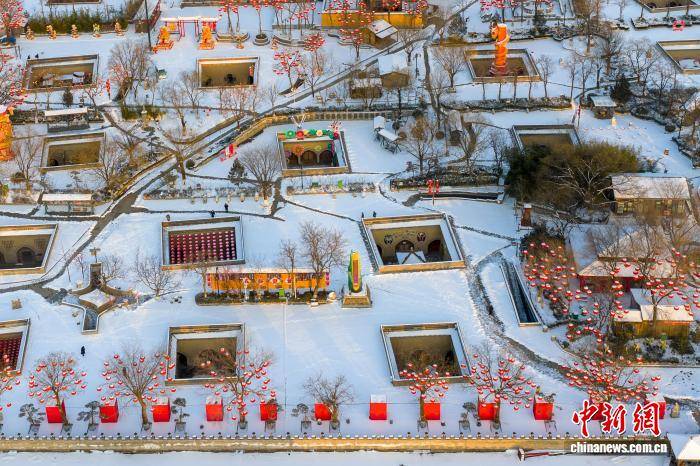 春节临近,河南三门峡陕州地坑院银装素裹,一盏盏红灯笼点缀古朴院落,与皑皑白雪相映成趣,浓浓年味扑面而来。图为1月20日,空中俯瞰雪后地坑院。 孙猛 摄