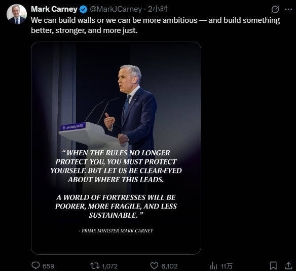 在演讲中,卡尼不点名地批评美国,称近年来,某些大国“将经济一体化用作武器,将关税用作杠杆,将金融基础设施用作胁迫工具,将供应链当作可利用的弱点。”