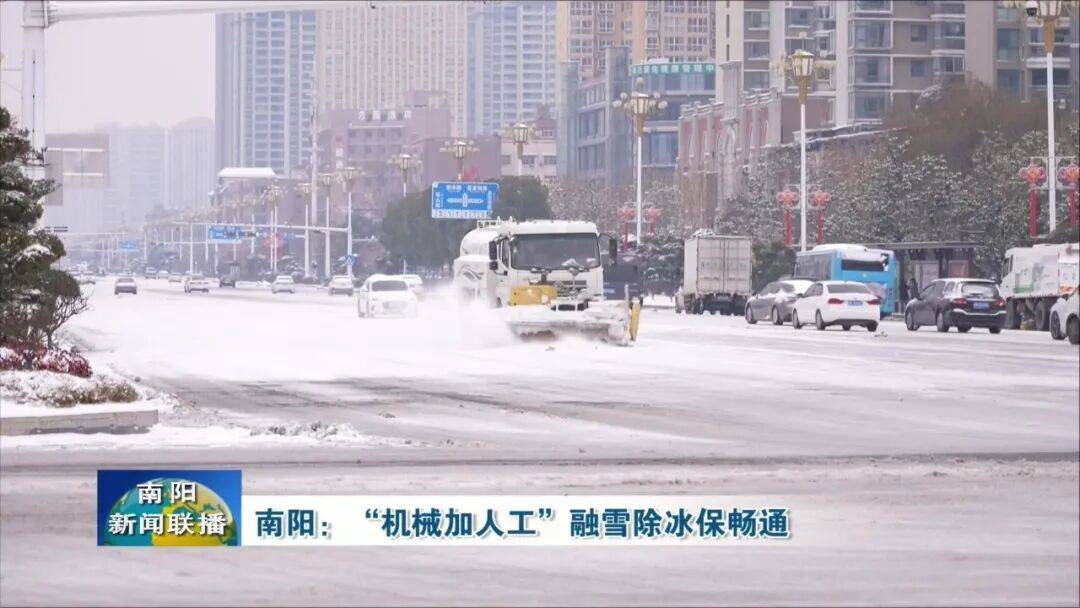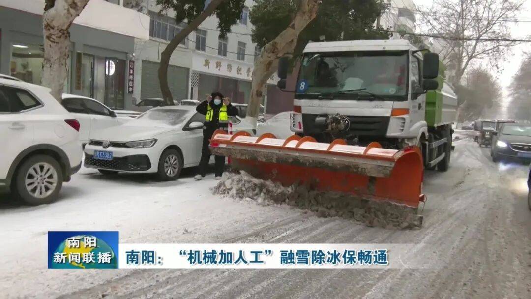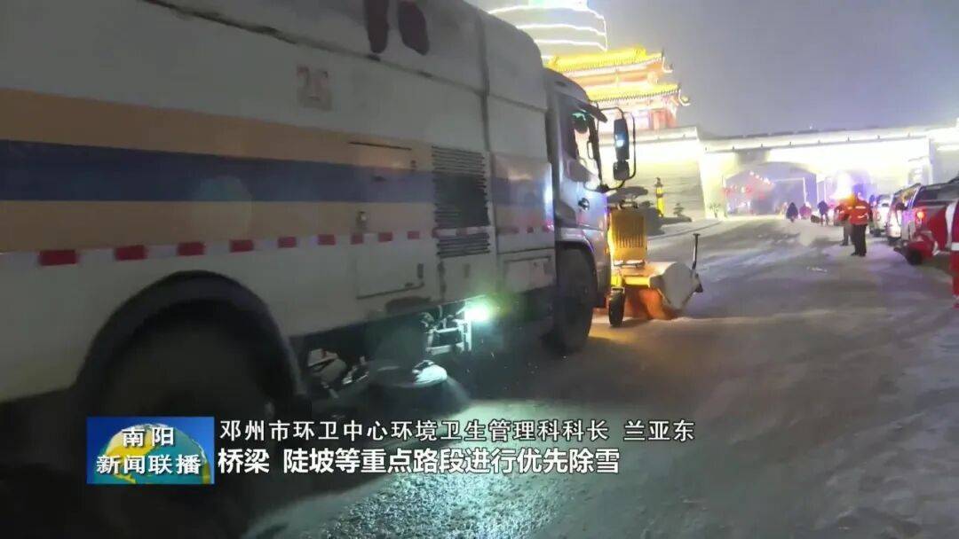 【邓州市环卫中心环境卫生管理科科长 兰亚东:组织100余名工人、调配各类除雪设备10台,从晚上八点开始,对城区主次干道、桥梁、陡坡等重点路段进行优先除雪。确保在早晚高峰来临前,打通城市交通动脉,保障行人、车辆出行安全。】