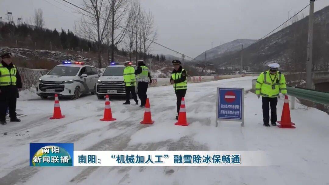 【南阳高速交警支队一大队民警 王自立:在此次雨雪冰冻恶劣天气应对中,我们采取平地机,融雪剂撒布车前推后撒,交警养护,压车带道,路产大队后方警戒的模式开展除雪融冰作业,确保雪停路通。】