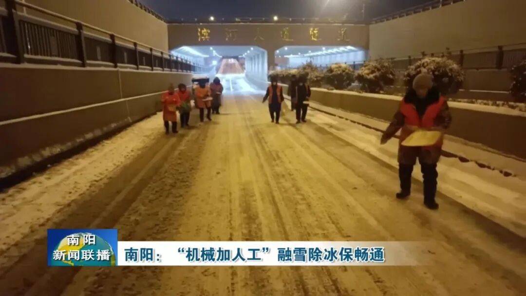 【南阳市政环卫服务中心技术科科长 祝雨:市政环卫部门共出动4800余名环卫工人,集结车辆200余台,对城区重点路段、桥梁、隧道进行融冰除雪工作。】