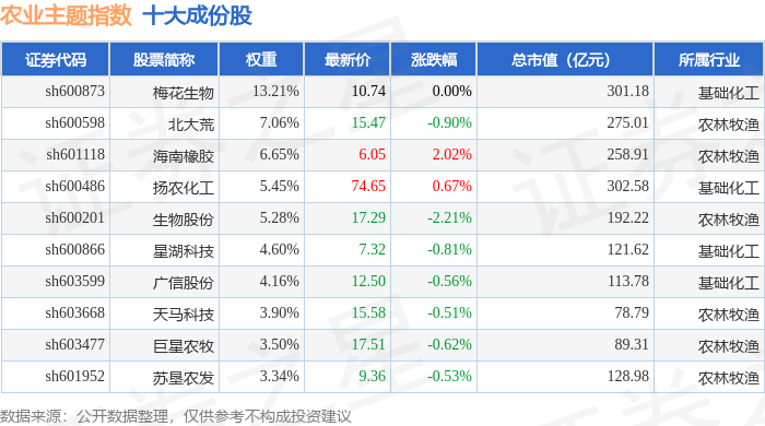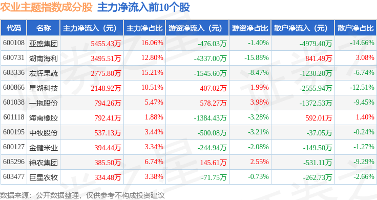 资金流向方面,农业主题(000122)指数成份股当日主力资金净流出合计3405.62万元,游资资金净流入合计75.78万元,散户资金净流入合计3329.84万元。成份股资金流向详情见下表: