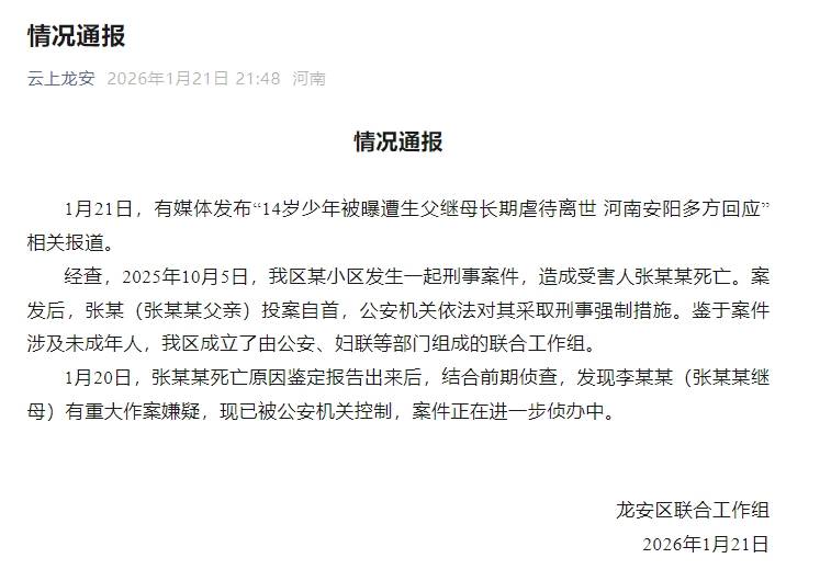 1月21日,有媒体发布“14岁少年被曝遭生父继母长期虐待离世 河南安阳多方回应”相关报道。
