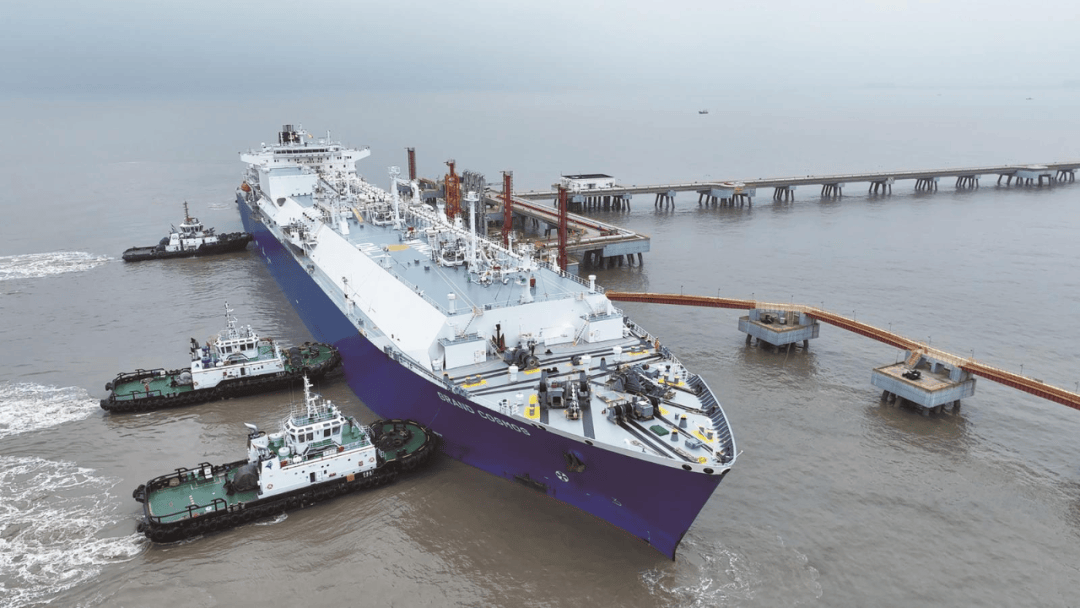 昨天下午,在南通海事局全程监管和维护下,超大型LNG(液化天然气)运输船“GRAND COSMOS”轮安全靠泊吕四港广汇能源启东LNG接收站码头。这是该接收站自2017年投运以来靠泊的第160艘LNG船舶,也是2025年南通吕四港迎来的首艘LNG运输船,为保障长三角地区秋冬交替季节的天然气供应稳定再添十足“底气”。