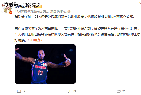 北京时间1月21日,根据媒体人赵探长的报道,CBA传奇外援威姆斯重返职业联赛,他将加盟NBL球队河南焦作文旅。