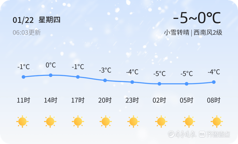 今天是1月22日(农历十二月初四),烟台迎来小雪转晴的天气。目前气温为-8.7℃,西南风2级,空气湿度65%,空气质量良好(PM2.5为30)。受冷空气影响,路面可能有积雪或道路结冰,市民出行需注意防滑,尤其是驾驶车辆时要保持安全车距,减速慢行。同时,气温较低,建议市民外出时增添衣物,做好保暖措施。