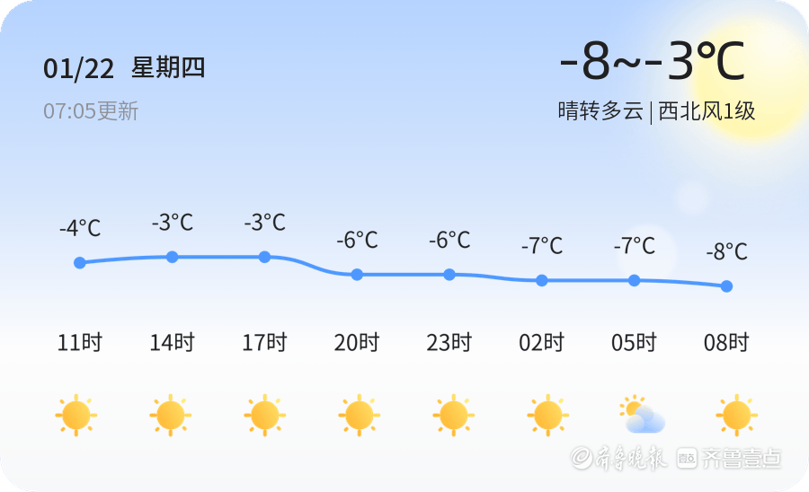 今天是2026年1月22日,农历十二月初四,枣庄市迎来寒潮天气。今天天气晴转多云,气温在-8℃到-3℃之间,西北风1级,空气湿度80%。PM2.5指数为78,空气质量良好。寒冷天气对市民的出行和日常生活带来一定影响,建议市民外出时注意保暖,穿好防寒衣物,避免长时间暴露在低温环境中。同时,由于天气寒冷,路面可能结冰,驾驶车辆时请减速慢行,确保行车安全。未来三天,枣庄市天气以晴到多云为主,气温将继续下降。预计23日气温在-7℃到2℃之间,24日气温在-2℃到5℃之间。需要注意的是,24日部分地区可能出现雨夹雪天气,风力较大,市民需提前做好防范准备,避免因天气变化带来的不便。特别是气温骤降可能对心脑血管疾病患者产生不利影响,建议此类人群尽量减少外出,做好保暖措施。温馨提示