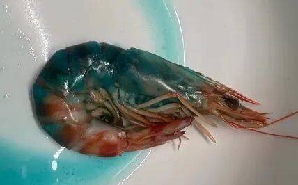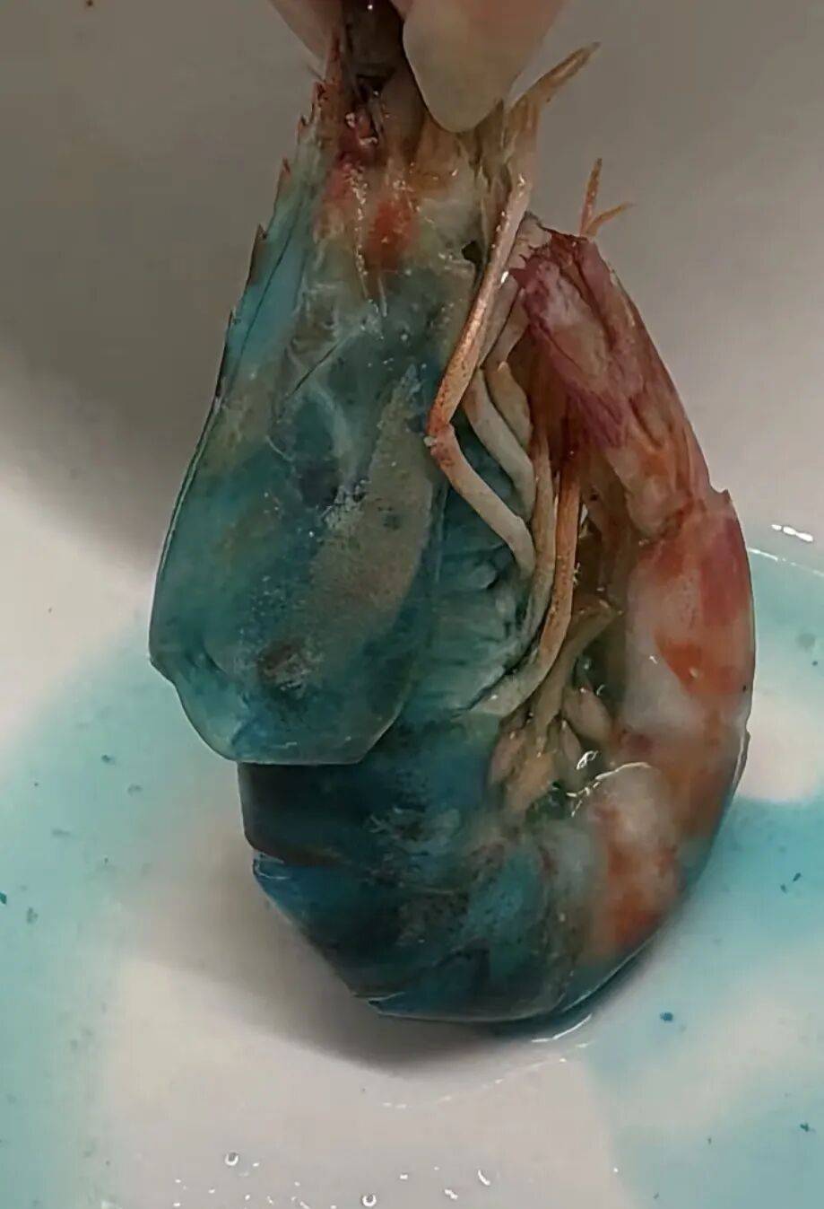 王女士说,斑节虾是20日上午花40多元购买的,煮好后便放进冰箱,当时没有细看。中午准备加热时发现了其中一只“蓝得吓人”,虾身内渗出蓝色颗粒状的东西,整份都没敢吃。