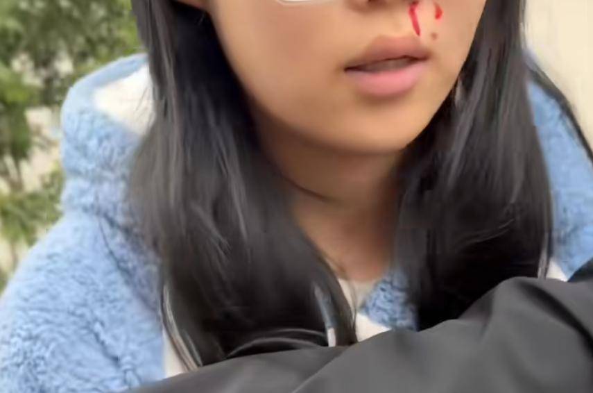 女子称被击打面部,口腔内侧出血,下颌肿起。邻居小姐姐面部疑似有血迹。
