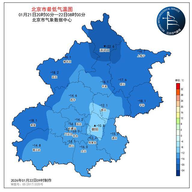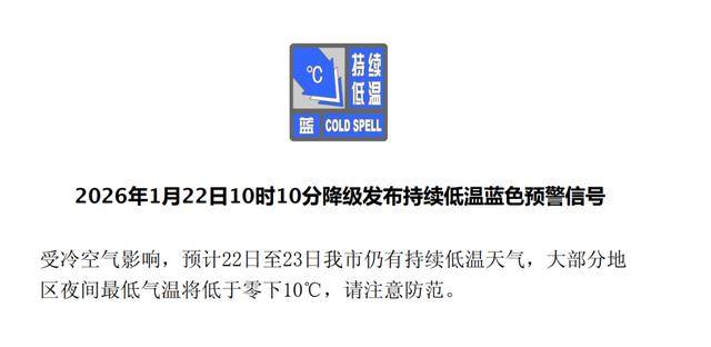 北京市气象台于2026年1月22日10时10分降级发布持续低温蓝色预警信号,提醒大家外出注意保暖。室外长时间作业人员应采取必要的防护措施。居家注意用火、用电、用气安全。