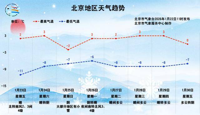 23 日夜间:晴;南转北风1、2级;平原地区最低气温-11℃,山区最低气温-16~-14℃。