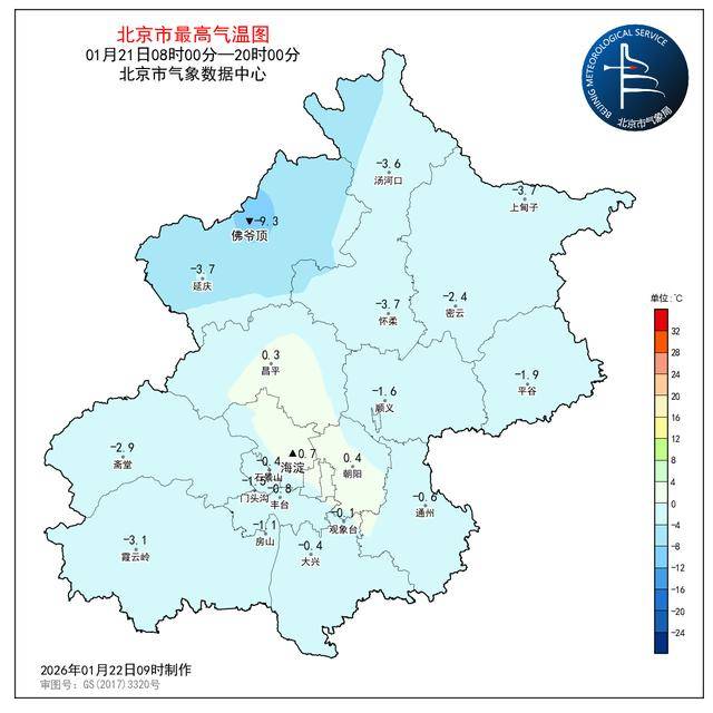 1月21日08时至1月22日08时,观象台最高气温-0.1℃(15:01),最低气温-12.7℃(5:01)。