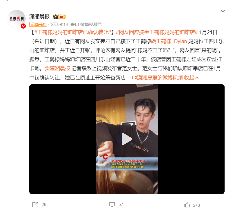 1月21日,近日有网友发文表示自己接下了王鹤棣妈妈位于四川乐山的油炸店,并于近日开张。评论区有网友提问“棣妈不开了吗?”,网友回复“是的呢”。据悉,王鹤棣妈妈油炸店在四川乐山经营已近二十年,该店曾因王鹤棣走红成为粉丝打卡地。潇湘晨报记者联系上视频发布者范女士。范女士与我们确认原炸串店已在1月中旬确认转让,她已在原址上开始筹备新店。
