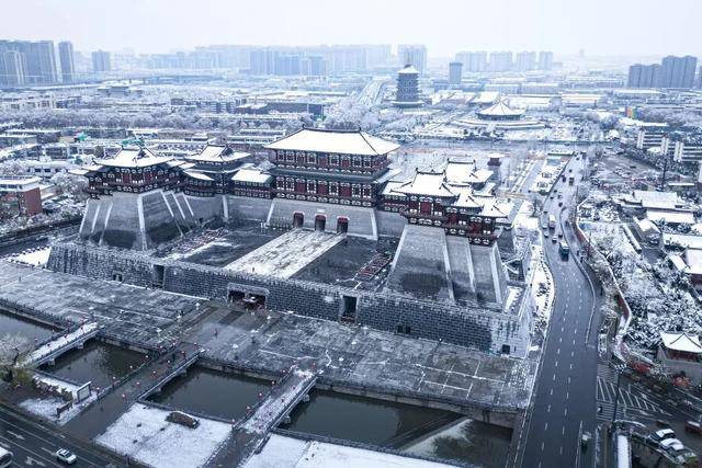 一下雪,洛阳便成了“神都”。应天门的飞檐覆满积雪,朱红围墙与洁白雪花相映成趣,让人恍若置身于万邦来朝的盛世大唐。