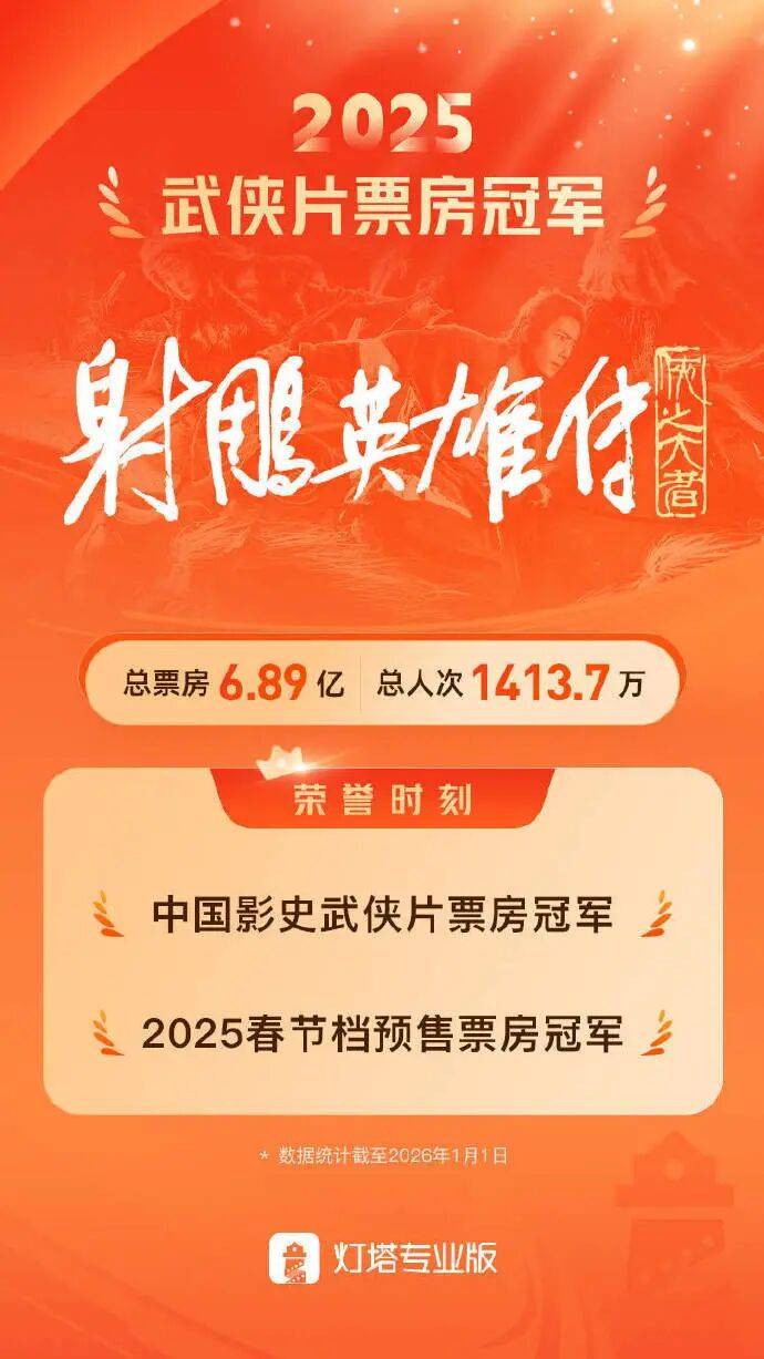 2025年春节档,由中影主导出品,徐克执导,肖战和庄达菲主演的武侠电影《射雕英雄传:侠之大者》公映。大IP改编,大导演掌舵,大流量托举,但影片最终票房仅为6.89亿,豆瓣评分仅为5.2。即使如此,内地影史武侠片票房冠军,竟然还是本片。