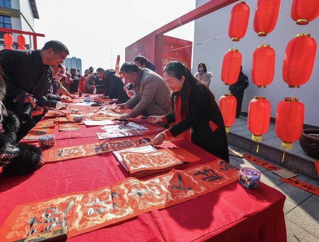 ↑ 1月22日,在周巷镇万安庄村文化礼堂“我们的村晚”民俗年俗展示活动现场,书法爱好者在给百姓书写福字和春联。