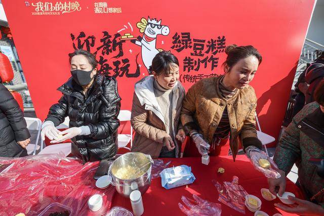 ↑ 1月22日,当地百姓在周巷镇万安庄村文化礼堂“我们的村晚”活动现场体验制作绿豆糕。