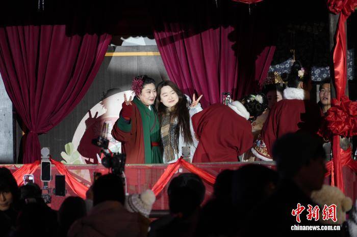 1月21日,河南开封万岁山武侠城以其NPC(非玩家角色)互动与各类实景场景,为游客带来沉浸式体验,吸引不少人前来合影打卡。近来,各大景区的NPC成为网络“顶流”,为文旅体验增添了更多趣味与沉浸感。图为NPC“王婆”与游客合影。连晨宇 摄