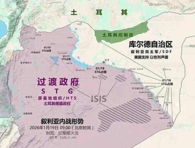 下方紫红色是亲以色列的德鲁兹人。左下角的深紫色是阿萨德政府被推翻时,以色列趁机抢占的戈兰高地。再就是灰色部分,目前有一些IS恐怖组织死灰复燃。