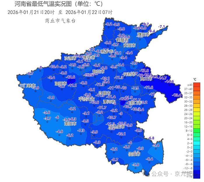 2026年1月21日20时至22日07时:我省中南部、东部出现-10℃以下低温天气。国家气象站最低温度前三依次为:商丘宁陵-15.5℃,商丘虞城-14.7℃,商丘夏邑-14.6℃。