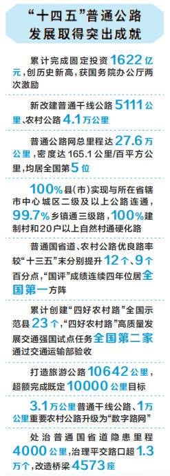 公路网络进一步完善。新改建普通干线公路5111公里、农村公路4.1万公里,普通公路网总里程达27.6万公里,密度达165.1公里/百平方公里,均居全国第5位,100%的县(市)实现与所在省辖市中心城区二级及以上公路连通,全省99.7%的乡镇通三级路,100%的建制村和20户以上自然村通硬化路,普通公路服务全省经济社会发展从“刚性需求”到“基本适应”迈进“满足向新”时代。