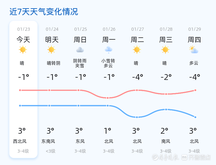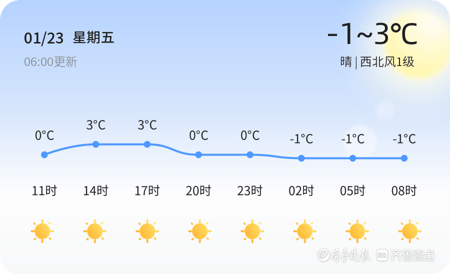 今天是2026年1月23日,农历十二月初五,星期五。青岛市迎来晴好天气,气温在-1℃到3℃之间,西北风1级。各区的天气情况基本一致,均为晴天,适宜户外活动。空气质量良好,PM2.5指数为54,湿度为46%,市民可以放心外出。