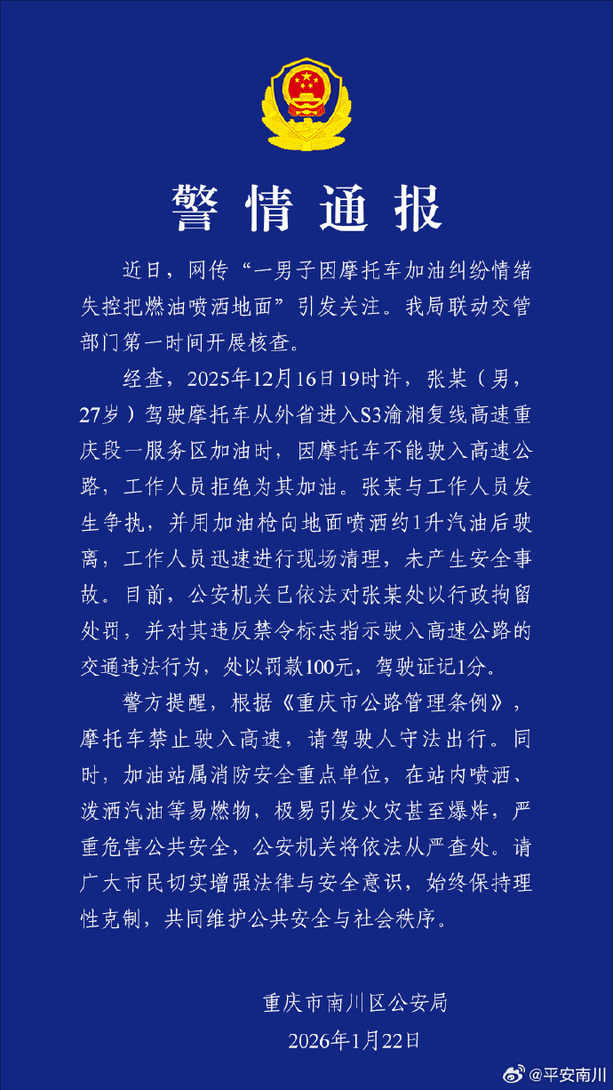 经查,2025年12月16日19时许,张某(男,27岁)驾驶摩托车从外省进入S3渝湘复线高速重庆段一服务区加油时,因摩托车不能驶入高速公路,工作人员拒绝为其加油。张某与工作人员发生争执,并用加油枪向地面喷洒约1升汽油后驶离,工作人员迅速进行现场清理,未产生安全事故。目前,公安机关已依法对张某处以行政拘留处罚,并对其违反禁令标志指示驶入高速公路的交通违法行为,处以罚款100元,驾驶证记1分。