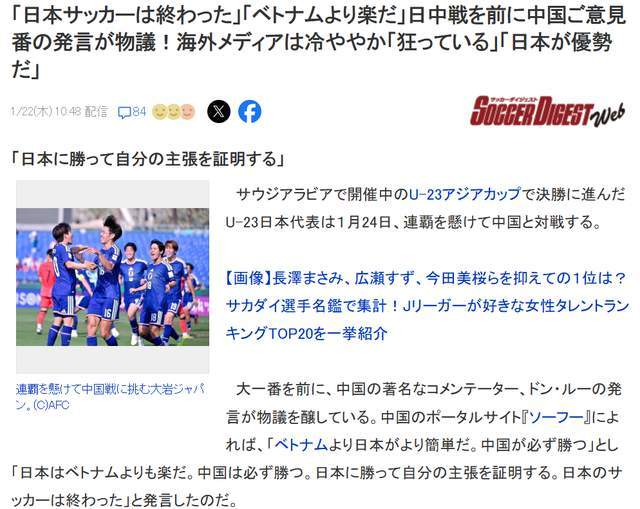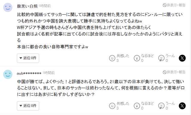 还有一个日本网友暴跳如雷,对董路日本足球完了的说法大为不满:“要是中国队赢了,估计会被捧上天。但就算这支21岁以下的日本队输了,我们也绝不会有半点遗憾。更何况,说日本足球完了?你们凭什么说出这种话?不觉得说出口都丢人现眼吗?”