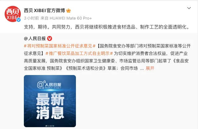 1月22日,“西贝XIBEI官方微博”发文回应预制菜国家标准等公开征求意见:支持,期待。共同努力,西贝将继续积极推进食材选品、制作工艺的全面透明化。